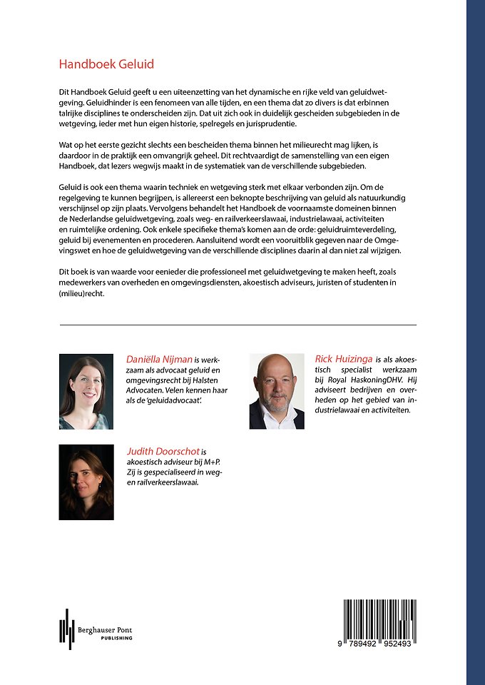 Geluid is ook een thema waarin techniek en wetgeving sterk met elkaar verbonden zijn. Om de regelgeving te kunnen begrijpen, is allereerst een beknopte beschrijving van geluid als natuurkundig verschijnsel op zijn plaats. Vervolgens behandelt het Handboek de voornaamste domeinen binnen de Nederlandse geluidwetgeving, zoals weg- en railverkeerslawaai, industrielawaai, activiteiten en ruimtelijke ordening. Ook enkele specifieke thema’s komen aan de orde: geluidruimteverdeling, geluid bij evenementen en procederen. Aansluitend wordt een vooruitblik gegeven naar de Omgevingswet en hoe de geluidwetgeving van de verschillende disciplines daarin al dan niet zal wijzigen.
