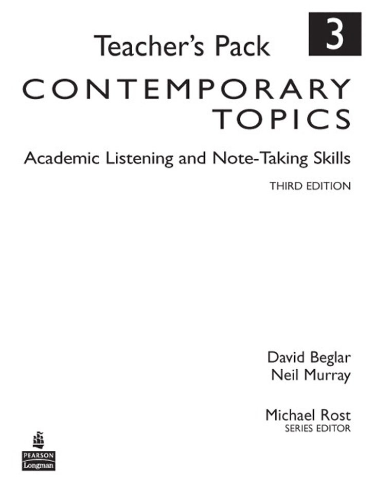 Teacher’s Pack for busy instructors with: •Suggested bonus activities •Teaching notes •Answer keys •Audioscripts •Simulated TOEFL Listening Test for each unit This interactive listening-speaking series prepares students for the challenges of college lectures with a wide range of listening, speaking, and note-taking strategies and skills. The lectures are drawn from a range of academic disciplines and reflect authentic lecture settings, featuring engaging instructors and live student audiences.