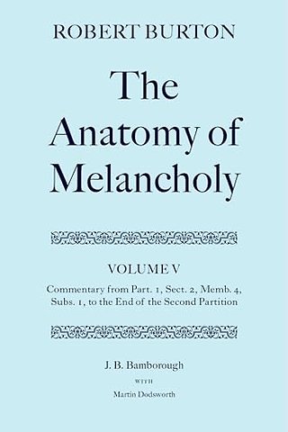 This, the fifth volume of the Clarendon Press edition of Robert Burton's Anatomy of Melancholy, contains commentary on the text from Partition 1, Section 2, Member 4, Subsection 1 until the end of Part. 1, and on the whole of the second Partition. It thus concludes Burton's account of the causes, the symptoms, and the prognosis of melancholy, and his examination of the remedies for the disease both spiritual and medical. As before, the aim of the commentary is to aid the reader to understand Burton's meaning (to which end all the passages in Latin are translated) and to identify the sources of his many quotations from and references to other authors. The third and last volume of the commentary, and of the edition, will contains a full Bibliography of these authors and brief biographical notes on them.
