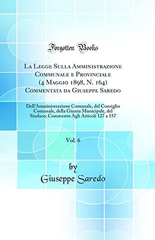 La Legge Sulla Amministrazione Communale e Provinciale (4 Maggio 1898, N. 164) Commentata da Giuseppe Saredo, Vol. 6: Dell'Amministrazione Comunale, del Consiglio Comunale, della Giunta Municipale, del Sindaco; Commento Agli Articoli 127 a 157