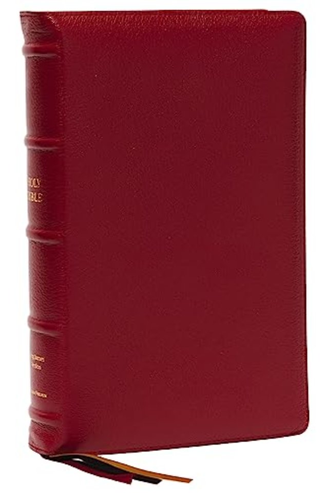 Navigate through Scripture easily with a KJV Bible that contains a unique single-column format and thousands of cross-references located at the ends of verses, wrapped in a stunning crimson goatskin cover and European Bible paper inside for a lifetime in God's Word.