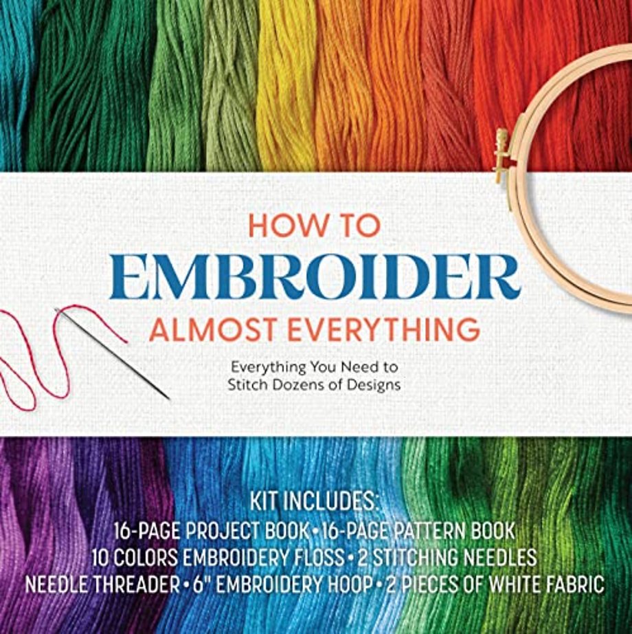 Everything You Need to Stitch Dozens of Designs – Kit Includes: 16-page Project Book, 16-page Pattern Book, 10 Colors of Embroidery Floss, 2 Stitching Needles, Needle Threader, 6” Embroidery Hoop, 2 Pieces of White Fabric