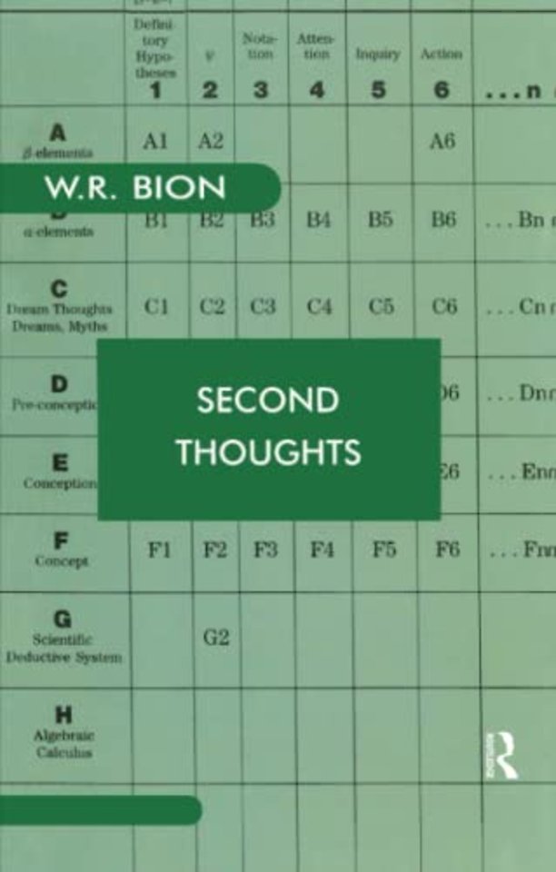 Second Thoughts is a collection of papers on Schizophrenia, Linking and Thinking, and is a commentary upon them in the light of later work. Originally composed between 1950 and 1962, it derives its title from the lengthy critical commentary which Bion attached to these case histories in the year of publication, 1967, and represents the evolutionary change of position marked in his three previous books and brought to further refinement in the present work.
