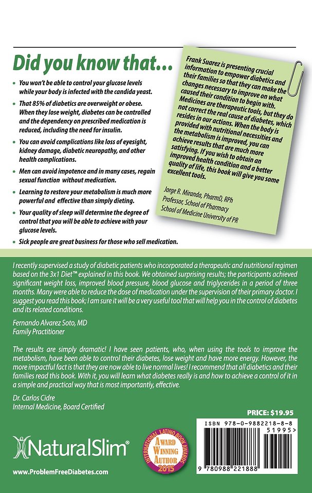 This book, Problem-Free Diabetes is the result of a vast five-year investigation by researcher Frank Suarez. It is a book dedicated to diabetic patients, to the family that takes care of them, and for the medical and health professionals who genuinely wish to see their patients improve without the need to continuously increase medications or witness the complications that ultimately are the fate of this condition.