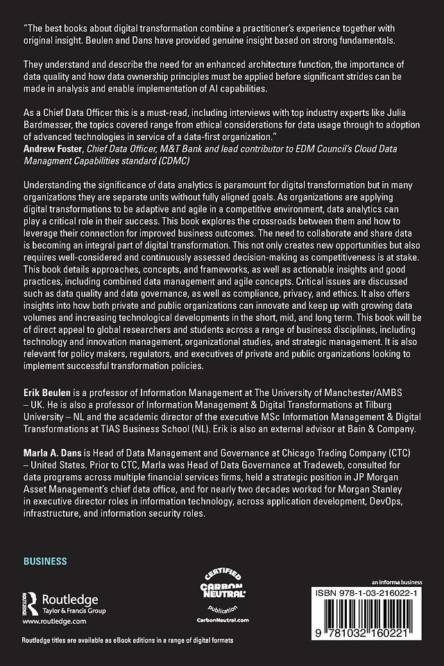 Understanding the significance of data analytics is paramount for digital transformation but in many organisations they are separate units without fully aligned goals. As organisations are applying digital transformations to be adaptive and agile in a competitive environment, data analytics can play a critical role for their success. This book explores the crossroads between them and how to leverage their connection for improved business outcomes.