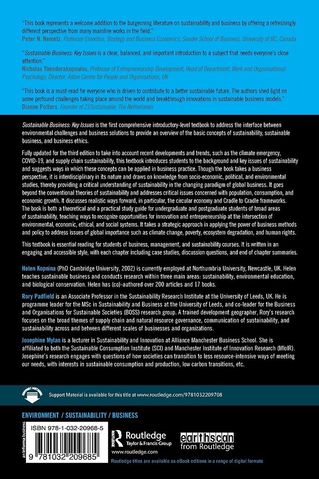 Fully updated for the third edition to take into account recent developments and trends, such as the climate emergency, COVID-19, and supply chain sustainability, this textbook introduces students to the background and key issues of sustainability and suggests ways in which these concepts can be applied in business practice. Though the book takes a business perspective, it is interdisciplinary in its nature and draws on knowledge from socio-economic, political, and environmental studies, thereby providing a critical understanding of sustainability in the changing paradigm of global business. It goes beyond the conventional theories of sustainability and addresses critical issues concerned with population, consumption, and economic growth. It discusses realistic ways forward, in particular, the circular economy and Cradle to Cradle frameworks. The book is both a theoretical and a practical study guide for undergraduate and postgraduate students of broad areas of sustainability, teaching ways to recognize opportunities for innovation and entrepreneurship at the intersection of environmental, economic, ethical, and social systems. It takes a strategic approach in applying the power of business methods and policy to address issues of global importance such as climate change, poverty, ecosystem degradation, and human rights.