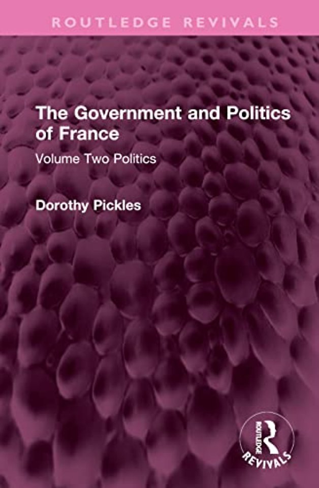 First published in 1973 The Government and Politics of France: Volume Two provides a comprehensive overview of French political history from 1958-1973. Dorothy Pickles writes with her characteristic elegance and the major themes are fully discussed and clearly related to their roots in earlier periods and to their consequences in later ones. The book covers the Algerian war and its aftermath; the notion of ‘participation’; educational reform; economic problems; regionalism; the changing nature of Gaullism; and in the field of foreign policy – attitudes of European Community; relations with the Atlantic powers and France’s attempts at achieving a world role. This book is a must read for students of French politics, political science, political institutions, and European politics.
