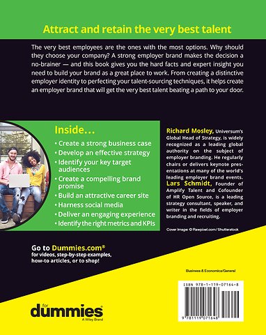 Employer Branding For Dummies is the clear, no–nonsense guide to attracting and retaining top talent. Written by two of the most recognized leaders in employer brand, Richard Mosley and Lars Schmidt, this book gives you actionable advice and expert insight you need to build, scale, and measure a compelling brand. You′ll learn how to research what makes your company stand out, the best ways to reach the people you need, and how to convince those people that your company is the ideal place to exercise and develop their skills. The book includes ways to identify the specific traits of your company that aligns with specific talent, and how to translate those traits into employer brand tactic that help you draw the right talent, while repelling the wrong ones. You′ll learn how to build and maintain your own distinctive, credible employer brand; and develop a set of relevant, informative success metrics to help you measure ROI. This book shows you how to discover and develop your employer brand to draw the quality talent you need.