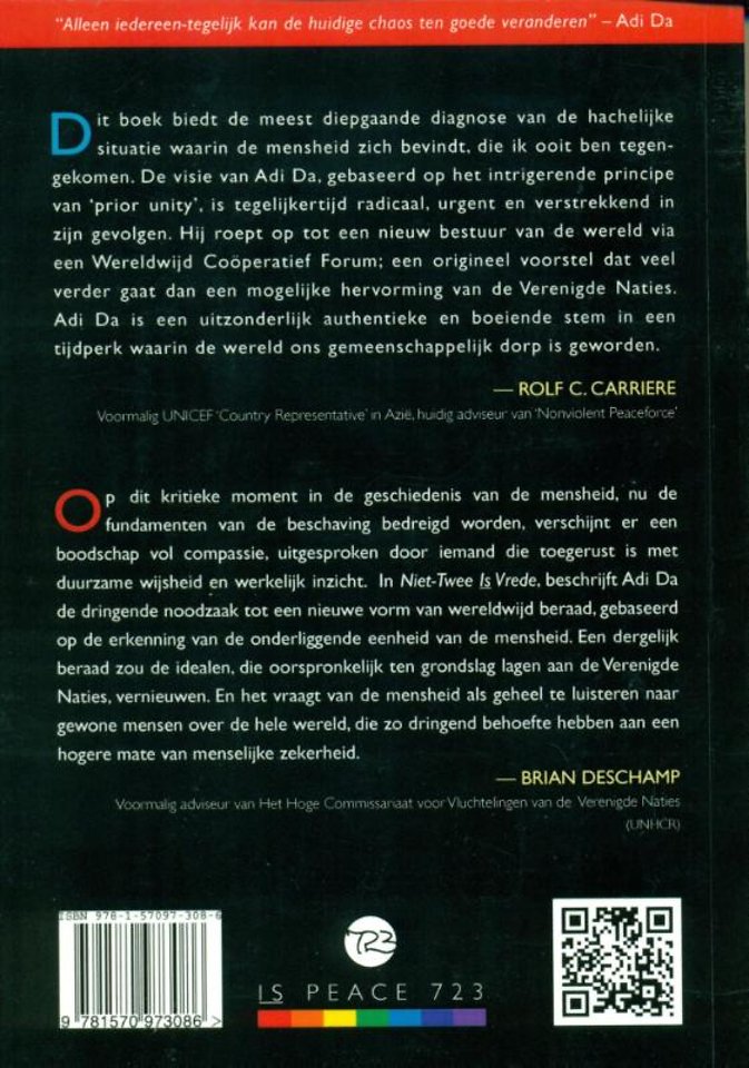 Dit boek biedt een diepgaande diagnose van de hachelijke situatie waarin de mensheid zich momenteel bevindt. De visie van Adi Da, gebaseerd op het intrigerende principe van 'prior unity', is verstrekkend in zijn gevolgen. Hij roept op tot een nieuw bestuur van de wereld via een Wereldwijd Coöperatief Forum; een radicaal voorstel dat veel verder gaat dan een mogelijke hervorming van de Verenigde Naties. Adi Da is een uitzonderlijke stem in een tijdperk waarin de wereld ons gemeenschappelijk dorp is geworden.
