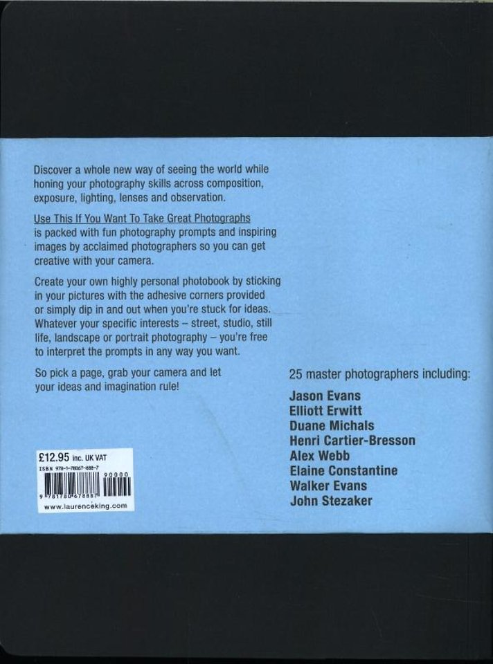 Use This if You Want to Take Great Photographs is packed with fun photography prompts and inspiring images by master photographers so you can get creative with your camera. Create your own highly personal photobook by sticking in your pictures with the adhesive corners provided or simply dip in and out when you're stuck for ideas. Whatever your specific interests – street, studio, still life, landscape, or portrait photography – you're free to interpret the prompts in any way you want.
