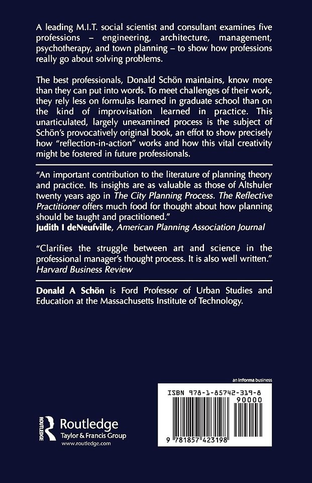 To meet the challenges of their work, they rely less on formulas learned in graduate school than on the kind of improvisation learned in practice. This unarticulated, largely unexamined process is the subject of Schon's provocatively original book, an effort to show precisely how 'reflection-in-action' works and how this vital creativity might be fostered in future professionals.