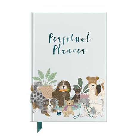 An undated 12 month planner with four lines per day, illustrated with colourful dogs in all shapes and sizes. The Perpetual Planner For Dog Lovers is the perfect tool to remember recurring key dates and events.