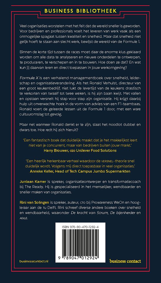 Meer over de auteurs‘Formule X’ van Jurriaan Kamer en Rini van Solingen is een verhalend managementboek over snelheid, leiderschap en organisatieverandering. Veel organisaties worstelen met het feit dat de wereld sneller is geworden. Voor bedrijven en professionals voelt het leveren van werk vaak als een onmogelijke spagaat tussen kwaliteit en snelheid. Maar dat snelheid niet gelijk hoeft te staan aan slecht werk, bewijst de wereld van de Formule 1.