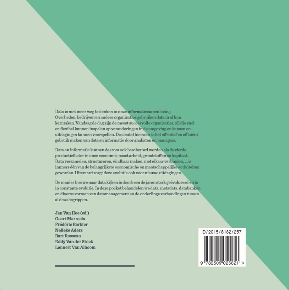 Data is niet meer weg te denken in onze informatiesamenleving. Overheden, bedrijven en andere organisaties gebruiken data in al hun kerntaken. Vandaag de dag zijn de meest succesvolle organisaties, zij die snel en flexibel kunnen inspelen op veranderingen in de omgeving en kansen en uitdagingen kunnen voorspellen. De sleutel hiervoor is het effectief en efficiënt gebruik maken van data en informatie door analisten en managers. Data en informatie kunnen daarom ook beschouwd worden als de vierde productiefactor in onze economie, naast arbeid, grondstoffen en kapitaal. Data verzamelen, structureren, vindbaar maken, met elkaar verbinden, ... is immers één van de belangrijkste economische en maatschappelijke activiteiten geworden. Uiteraard zorgt deze evolutie ook voor nieuwe uitdagingen. De manier hoe we naar data kijken is doorheen de jaren sterk geëvolueerd en is in constante evolutie. In deze pocket behandelen we data, metadata, databanken en diverse vormen van datamanagement en de onderlinge verhoudingen tussen al deze begrippen.