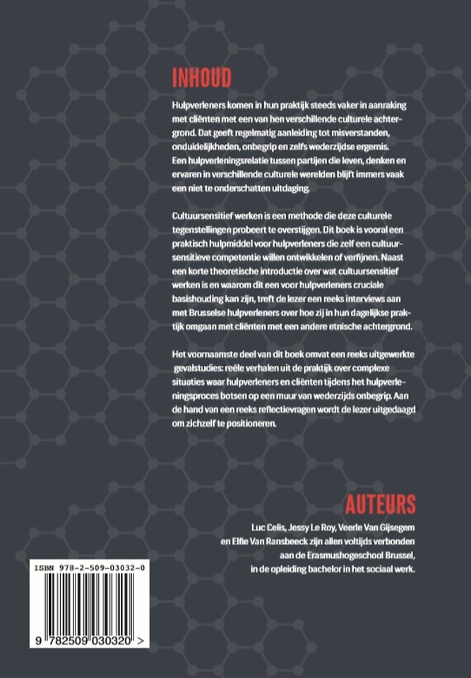 Hulpverleners komen in hun praktijk steeds vaker in aanraking met cliënten met een van hen verschillende culturele achtergrond. Dat geeft regelmatig aanleiding tot misverstanden, onduidelijkheden, onbegrip en zelfs wederzijdse ergernis. Een hulpverleningsrelatie tussen partijen die leven, denken en ervaren in verschillende culturele werelden blijft immers vaak een niet te onderschatten uitdaging. Cultuursensitief werken is een methode die deze culturele tegenstellingen probeert te overstijgen. Dit boek is vooral een praktisch hulpmiddel voor sociaal werkers die zelf een cultuursensitieve competentie willen ontwikkelen of verfijnen. Naast een korte theoretische introductie over wat cultuursensitief werken is en waarom dit een voor sociaal werkers cruciale basishouding kan zijn, treft de lezer een reeks interviews aan met Brusselse hulpverleners, over hoe zij in hun dagelijkse praktijk omgaan met cliënten met een andere etnische achtergrond. Het voornaamste deel van dit boek omvat een reeks uitgewerkte gevalstudies: reële verhalen uit de praktijk over complexe situaties waarin hulpverleners en cliënten tijdens het hulpverleningsproces botsen op een muur van wederzijds onbegrip. Aan de hand van een reeks reflectievragen wordt de lezer uitgedaagd om zichzelf te positioneren.