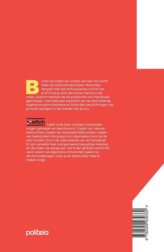 Als vzw-deskundigen heeft SCWITCH sinds haar ontstaan honderden vragen gekregen en beantwoord. Vragen van nieuwe bestuurders, vragen van bezorgde bestuurders, vragen van bestuurders die graag hun organisatie mooi op de rails houden. Dat is de meerwaarde van dit handboek. Er zijn namelijk heel wat gemeenschappelijke kwesties, en die halen we graag aan. Het is een globaal overzichtswerk waarin we algemene antwoorden geven op de doorsneevragen waar je als bestuurder mee te maken krijgt.