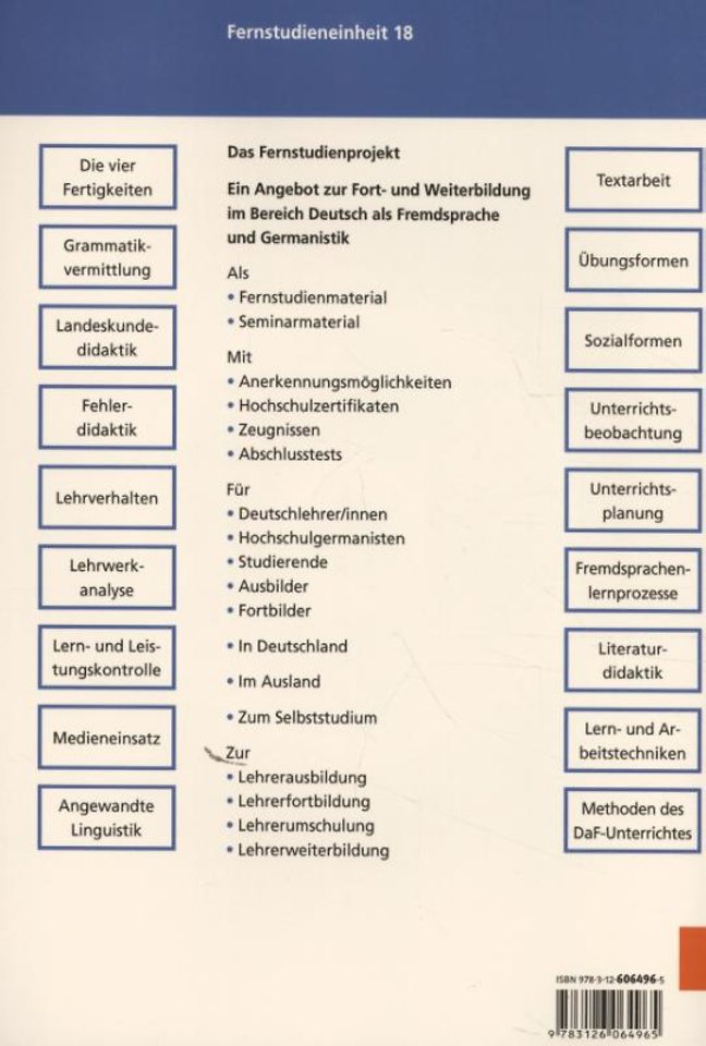 Durch integrierte Aufgaben werden Sie durch das Selbststudienmaterial geleitet, erhalten zudem durch Unterrichtsmitschnitte auf der beiliegenden DVD Einblicke in die Unterrichtsrealität von Deutsch als Fremdsprache.