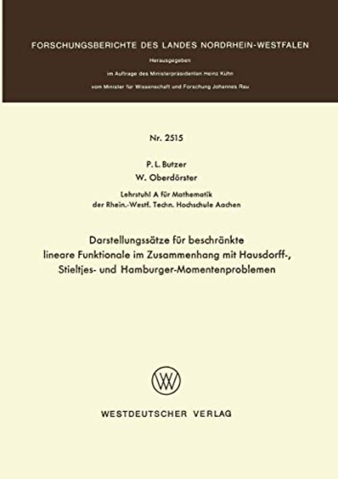 1. Einleitung und Problemstellung.- 2. Riesz-Darstellungssätze.- 3. Das Hausdorff-Momentenproblem.- 4. Das Hamburger- und Stieltjes-Momentenproblem und verwandte Probleme.- 5. Darstellbarkeit von Folgen als Koeffizienten einer Orthogonalentwicklung.- 6. Anwendungen auf Laguerre-, Hermite- und Legendre-Entwicklungen.- 6.1 Modifiziertes Laguerre-Momentenproblem.- 6.2 Modifiziertes Hermite-Momentenproblem.- 6.3 Modifiziertes Legendre-Momentenproblem.- 7. Ein Vergleich zwischen dem Hausdorff-Momentenproblem und dem modifizierten Legendre-Momentenproblem.- 8. Der Zusammenhang zwischen den modifizierten Momentenproblemen und den Riesz-Sätzen.