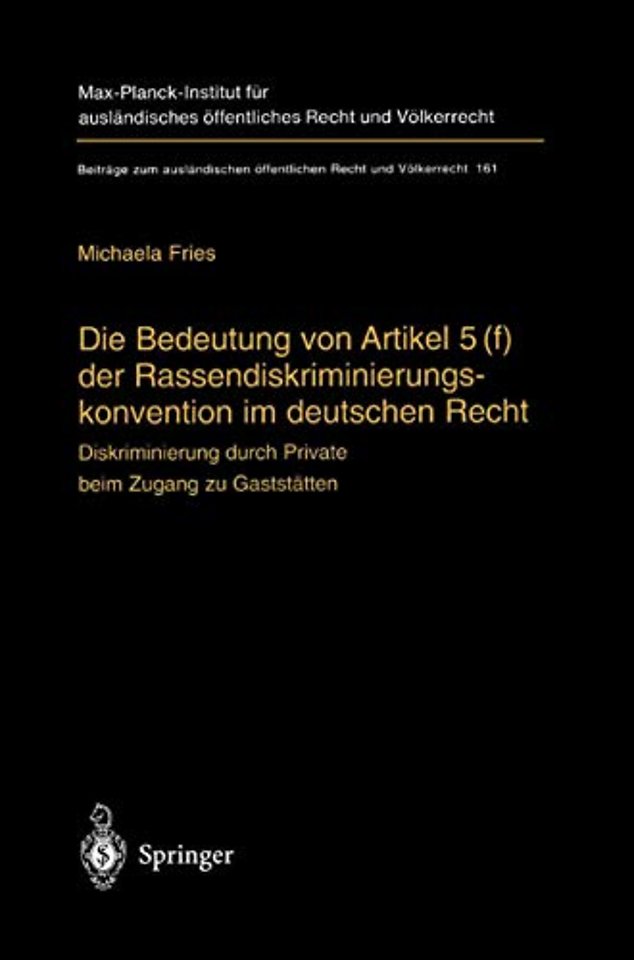 und Gang der Untersuchung.- 1. Teil: Die völkerrechtlichen Verpflichtungen aus Artikel 5(f) RDK.- 1. Kapitel: Der Inhalt des Artikels 5 (f) RDK: Das Recht auf Zugang zu für die Öffentlichkeit vorgesehenen Orten und Dienstleistungen.- A. Struktur der Norm.- B. Die Liste der Menschenrechte in Artikel 5 RDK.- I. Die rechtliche Funktion der Liste.- II. Besonderheiten des Artikels 5 (f) RDK.- C. Die Tatbestandsmerkmale des Artikels 5 (f) RDK.- I. Zugang.- II. Kein Kontrahierungszwang.- III. Die Leistungskriterien.- IV. Die Öffentlichkeit.- 1. Wortlaut und teleologische Vorgaben.- 2. Rückgriff auf Artikel 1 RDK: Der auf das „öffentliche Leben“ begrenzte Anwendungsbereich der Konvention.- a) Keine Begrenzung auf den Bereich des öffentlichen Rechts2.- b) Das private Leben als Gegenbegriff zum öffentlichen Leben3.- (1) Die enge persönliche Lebenssphäre.- (2) Die zum privaten Leben zählenden Sozialkontakte.- (3) Gleichlauf von „öffentlichem Leben“ und „öffentlicher Zugänglichkeit“.- V. Zwischenergebnis.- 2. Kapitel: Der Anwendungsbereich des Artikels 5 (f) RDK: Rassendiskriminierung i. S. d. Artikels 1 RDK.- A. Das verbotene Unterscheidungskriterium der Rasse.- I. Rasse und Hautfarbe.- II. Nationaler Ursprung.- III. Ethnischer Ursprung.- IV. Abstammung.- V. Abgrenzung zu Diskriminierungen aufgrund anderer Kriterien.- VI. Zuordnung eines Individuums zu einer rassischen Gruppe.- VII. Zwischenergebnis.- B. Unterscheidungen aufgrund der Staatsangehörigkeit.- I. Keine Beschränkung der Konvention auf die eigenen Staatsangehörigen.- II. Erlaubte Unterscheidungen aufgrund der Staatsangehörigkeit.- C. Die Merkmale der Diskriminierung.- I. Benachteiligende Ungleichbehandlung im Bereich der Menschenrechte.- 1. Die Ungleichbehandlung.- 2. Benachteiligung als Ziel oder Folge der Ungleichbehandlung.- 3. Menschenrechte und Grundfreiheiten, auf die sich das Diskriminierungsverbot bezieht.- II. Fehlen eines Rechtfertigungsgrundes.- 1. Begriffsbestimmung.- 2. Abhängigkeit der Rechtfertigung von der Art der Diskriminierung.- a) Formen diskriminierenden Handelns7.- b) Rechtfertigung bei vorsätzlicher Diskriminierung7.- c) Rechtfertigung bei unmittelbarer Diskriminierung7.- d) Rechtfertigung bei mittelbarer Diskriminierung8.- (1) Schutz vor mittelbarer Diskriminierung durch die Konvention.- (2) Rechtfertigungsmaßstab für staatliches Handeln.- (3) Rechtfertigungsmaßstab für privates Handeln.- D. Ausdrückliche Grenzen des Anwendungsbereichs der Konvention.- E. Zwischenergebnis.- 3. Kapitel: Die staatlichen Handlungspflichten.- A. Adressaten der Verpflichtungen.- B. Konkretisierung der Handlungspflichten durch die Praxis des Ausschusses zur Beseitigung jeder Form der Rassendiskriminierung?.- I. Die in den „Concluding Observations“ enthaltenen Anforderungen an die Staaten zu Artikel 5 RDK.- II. Rechtliche Bedeutung der Praxis des Ausschusses.- C. Maßnahmen gegen staatliche Rassendiskriminierung.- I. Der Wortlaut des Artikels 5 RDK.- II. Rückgriff auf Artikel 2 RDK.- III. Das Verbot staatlicher Diskriminierung.- IV. Die Überprüfungspflichten der Staaten.- D. Maßnahmen gegen Rassendiskriminierung durch Privatpersonen.- I. Das Verbot, Rassendiskriminierung durch Dritte zu schützen oder zu fördern.- II. Die Pflicht, Rassendiskriminierung durch Private zu verbieten.- 1. Pflicht zum Ergreifen positiver Maßnahmen.- 2. Pflicht zum Erlaß von Rechtsvorschriften, soweit die Umstände sie erfordern.- a) Der Streitstand11.- b) Vorgaben des Wortlauts12.- (1) Die Eignung der Mittel.- (2) Verbieten und Beenden.- (3) Der Begriff der Rechtsvorschriften.- c) Vorgaben aus der Systematik der RDK12.- (1) Artikel 4 RDK.- (2) Artikel 6 RDK: Effektiver Rechtsbehelf.- (a) Anwendbarkeit auf Artikel 2 RDK.- (b) Inhaltliche Vorgaben an das staatliche Verbot.- d) Teleologische Erwägungen13.- e) Historische Ergänzungen13.- 3. Zwischenergebnis — Die konkrete Ausgestaltung des Verbotes privater Rassendiskriminierung.- E. Fördernde Maßnahmen und allgemeine Pflichten zur Beseitigung der Rassendiskriminierung.- I. Förderung von Rassenintegration.- II. Pflicht zum Ergreifen positiver Maßnahmen.- III. Allgemeine Politik der Beseitigung von Rassendiskriminierung.- F. Gleichheit vor dem und durch das Gesetz.- I. Gleichheit ohne Unterscheidung aufgrund der Rasse.- 1. Die Gleichheitsgarantie.- 2. Verweis auf die Grundsätze des Artikels 1 RDK.- 3. Begünstigte des Gleichheitsprinzips.- II. Gleichheit vor dem Gesetz.- 1. Bedeutung des Prinzips.- 2. Anforderungen an die Exekutive.- a) Verpflichtung zur rechtlichen Gleichheit bei der Gesetzesanwendung15.- b) Verpflichtung zu faktischer Gleichheit?16.- 3. Anforderungen an die Judikative.- III. Gleichheit durch das Gesetz.- 1. Bindung des Gesetzgebers an das Gleichheitsgebot.- 2. Die Verpflichtung zur faktischen Gleichheit.- G. Zwischenergebnis.- 2. Teil: Die Rechtslage in der Bundesrepublik Deutschland.- 4. Kapitel: Einwirkung der RDK in den innerstaatlichen Rechtsraum.- A. Rezeption der RDK.- I. Artikel 59 Absatz 2 GG.- 1. Verfahren bei der RDK: Der Regelfall des Artikels 59 Absatz 2 GG.- 2. Die Umsetzung des Artikels 5 (f) RDK: Innerstaatliche Geltung.- a) Gegenstand der Umsetzung17.- b) Bedeutung der innerstaatlichen Geltung: Artikel 20 Absatz 3 GG18.- II. Artikel 25 GG.- 1. Verträge als allgemeine Regeln des Völkerrechts.- 2. Artikel 5 (f) RDK als Ausdruck von Völkergewohnheitsrecht.- B. Die Einwirkungsmöglichkeiten von Artikel 5 (f) RDK in die deutsche Rechtsordnung: Unmittelbare und mittelbare Anwendbarkeit.- I. Unmittelbare Anwendbarkeit.- 1. Voraussetzungen.- 2. Anwendung der Grundsätze auf Artikel 5 (f) RDK.- a) Das Diskriminierungsverbot19.- b) Gleichheit vor dem Gesetz19.- II. Mittelbare Anwendbarkeit.- 1. Die Auslegung deutscher Rechtsnormen unter Berücksichtigung von Artikel 5 (f) RDK.- 2. Die völkerrechtsfreundliche Auslegung der Grundrechte.- C. Die Kompetenz des Bundesverfassungsgerichts, die Einhaltung von Artikel 5 (f) RDK zu kontrolli