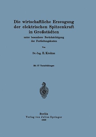 A. Der Begriff der Spitzenkraft und die Hauptbedingung für ihre wirtschaftliehe Erzeugung.- I. Die untere Zeitgrenze tmin der Spitzenkrafterzeugung, bestimmt durch die Überlastungsfähigkeit der Betriebsmittel.- a) Dauerbetrieb.- b) Stoßspitzenbetrieb.- c) Dauerspitzenbetrieb.- II. Die obere Zeitgrenze tmax der Spitzenkrafterzeugung, bestimmt durch den Einfluß der leistungsabhängigen Kosten kL auf die Gesamtkosten k einer kWh.- a) Die Gestehungskosten h einer kWh als Maßstab für wirtschaftliche Elektrizitätsversorgung.- 1. Die von der Leistung und der Benutzungsdauer abhängigen Kosten kL.- 2. Die von der Arbeit abhängigen und von der Benutzungsdauer unabhängigen Kosten kA.- b) Zahlenmäßige Festlegung der verschiedenen Belastungsarten.- 1. Grund- oder Stammbelastung Ng, Dauerbelastung Nd, Mittelbelastung Nm und Spitzenbelastung Nsp.- 2. Erläuterung dieser Begriffe an Hand der charakteristischen Kurven: Jahresleistungsdauerlinie, Kurve der Jahresarbeitswerte.- III. Zusammenfassung.- B. Die Spitzenkrafterzeugung am Verbrauchsort (Ortsspitzenkrafterzeugung).- I. Dauerkraftquellen.- a) Preiskennlinien zum Vergleich der Kraftquellen in bezug auf die Wirtschaftlichkeit bei verschiedener Benutzungsdauer.- b) Beispiele: Dampfkraftwerk, Dieselmotorenkraftwerk.- c) Grenz-Benutzungsdauer tgr.- d) Die Ausbauleistung auf Grund der Preiskennlinien und der Jahresleistungsdauerlinie, der „horizontale Einsatz“ der Kraftquellen.- e) Die Berechnung der jährlichen Kosten K und der Ersparnis E bezw. der Verteuerung V gegenüber dem reinen Grundkraftwerksbetrieb: die Kostenlinie.- f) Betriebsforderungen.- II. Speicherkraftquellen.- a) Die spezifischen Stromerzeugungskosten h einer kWh und der Begriff der „Vollast-Entladedauer te“.- b) Die Preiskennlinienschar.- c) Die resultierende Preiskennlinie auf Grund der Tages- und Jahresleistungsdauerlinie.- d) Beispiele: Pumpspeicherwasserkraftwerk, elektrischer Speicher.- e) Vorteile für den Betrieb.- f) „Schräger Einsatz“ bei großen Anheiz- und Leerlaufverlusten der Grundkraftquelle.- C. Die Spitzenkrafterzeugung fern vom Verbrauchsort unter Berücksichtigung der Fortleitungskosten. (Fernspitzenkrafterzeugung).- a) Die spezifischen Fortleitungskosten k einer kWh.- b) Die Preiskennlinienschar des Netzes, Beispiele.- c) Die Summenpreiskennlinien.- D. Vergleich zwischen Orts- und Fernspitzenkrafterzeugung.- a) Der günstigste Angriff der Spitzenkrafterzeuger im Netz.- b) Betriebsführung.- e) Ausführliches Beispiel.- 1. Leistungen und Arbeitsmengen.- 2. Mittlere Benutzungsdauer und zugehörige Kosten.- 3. Ersparnis ohne Berücksichtigung der Reserven.- 4. Reserven.- 5. Zusammenstellung der Kosten.- E. Zusammenfassung der Ergebnisse.