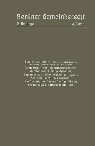 Schulverwaltung. Abt. 2 (Höhere Schulen, Fachschulen, Fortbildungsschulen, Beuthschule), Turnwesen, Archiv, Magistratsbibliothek, Stadtbibliothek, Nachrichtenamt, Gemeindeblatt, Gemeinderecht (Herausgabe), Statistik, Märkisches Museum, Kunstdeputation