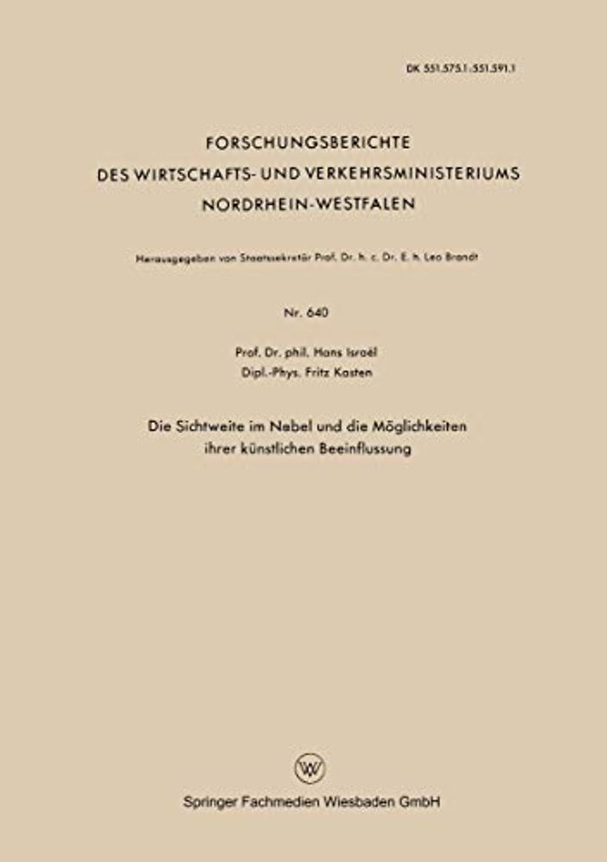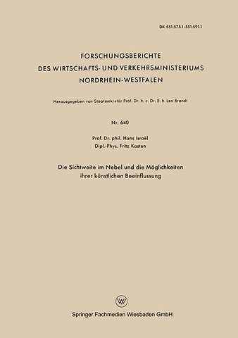 Gliederung.- Zusammenfassung des Inhalts der Arbeit.- 1. KOSCHMIEDERs Theorie der horizontalen Sichtweite.- 1.1 Definitionen und Voraussetzungen.- 1.2 Die Luftlichtformel.- 1.3 Die Sichtweiteformel.- 2. Messung der Sichtweite auf Grund der KOSCHMIEDER-Formel.- 2.1 Meßverfahren.- 2.2 Meßgenauigkeit.- 3. Zusammenhang zwischen Sichtweite und physikalischen Größen des Nebels.- 3.1 Tropfenradius und Sichtweite.- 3.2 Tropfenkonzentration und Wassergehalt.- 3.3 Die TRABERTsche Formel.- 4. Die Beeinflussung der Sichtweite durch äußere Eingriffe.- 4.1 Verdampfungsverfahren.- 4.2 Mechanische Beseitigung der Nebeltröpfchen.- 5. Beseitigung der Nebeltröpfchen durch Koaleszenz mit — den Nebel frei durchfallenden — großen Wassertropfen.- 5.1 Koaleszenz-Prozeß und collection efficiency.- 5.2 Wolken- (Nebel-)Auflösung durch Regen.- 6. Laborversuche zur Sichtbesserung im Nebel.- 6.1 Erzeugung eines beständigen Nebels zeitlich konstanter Dichte.- 6.2 Messung von Sichtweite und Tropfengröße.- 6.3 Künstliche Beeinflussung des Labor-Nebels.- 7. Freiversuche zur Sichtbesserung im Nebel.- 7.1 Vergleich Labor-Nebel/natürlicher Nebel.- 7.2 Der in den Freiversuchen verwendete Wassersprenger.- 7.3 Beschreibung der Freiversuche.- 7.4 Vorschläge zur Weiterführung der Freiversuche.- 8. Zusammenfassung der Ergebnisse.- 9. Literaturverzeichnis.