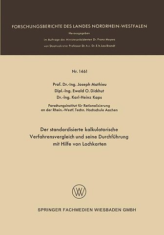 1. Aufgabe und Ziel des standardisierten kalkulatorischen Verfahrensvergleiches.- 2. Methode und Durchführung des standardisierten kalkulatorischen Verfahrensvergleiches.- 3. Verfahrensvergleich auf Lochkarten mit Hilfe konventioneller Lochkartenmaschinen.- 4. Verfahrensvergleich auf Lochkarten mit Hilfe eines Elektronenrechners.- 5. Schlußbemerkung.