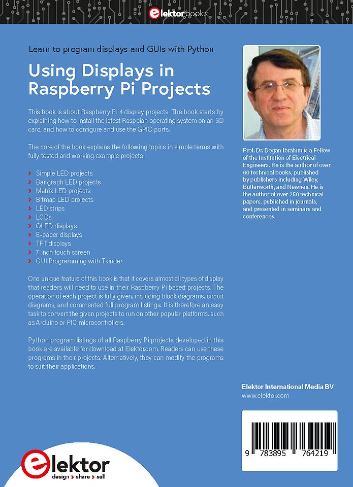 This book is about Raspberry Pi 4 display projects. The book starts by explaining how to install the latest Raspbian operating system on an SD card, and how to configure and use the GPIO ports.