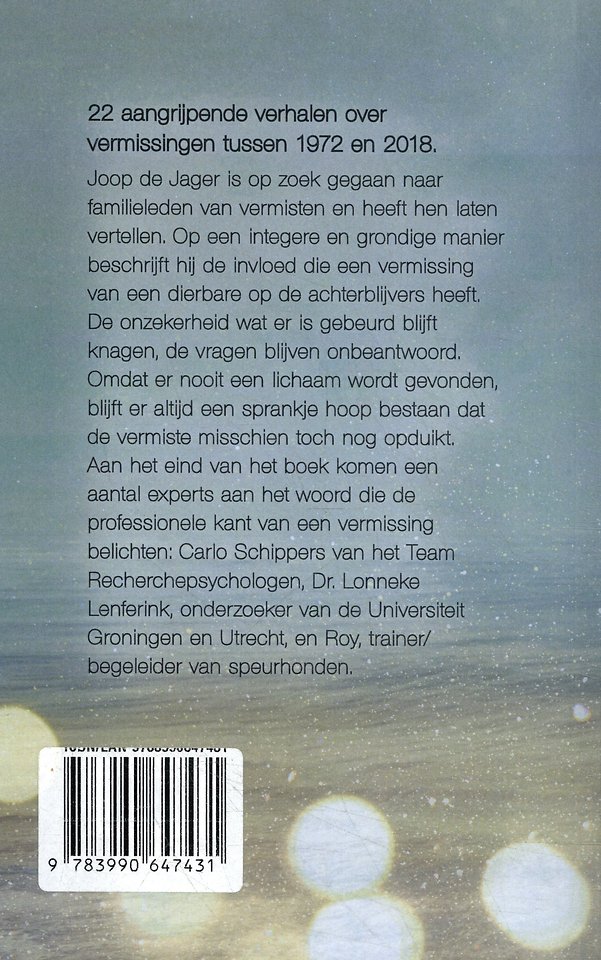 Joop de Jager is op zoek gegaan naar familieleden van vermisten en heeft hen laten vertellen. Op een integere en grondige manier beschrijft hij de invloed die een vermissing van een dierbare op de achterblijvers heeft. De onzekerheid wat er is gebeurd blijft knagen, de vragen blijven onbeantwoord. Omdat er nooit een lichaam wordt gevonden, blijft er altijd een sprankje hoop bestaan dat de vermiste misschien toch nog opduikt.