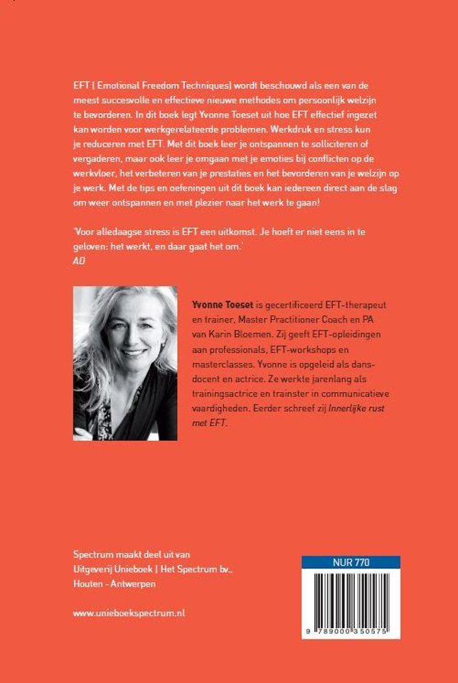 EFT ( Emotional Freedom Techniques) wordt beschouwd als een van de meest succesvolle en effectieve nieuwe methodes om persoonlijk welzijn te bevorderen. In EFT werkt! legt Yvonne Toeset uit hoe EFT effectief ingezet kan worden voor werkgerelateerde problemen. Werkdruk en stress kun je reduceren met EFT. Met dit boek leer je ontspannen te solliciteren of vergaderen, maar ook leer je omgaan met je emoties bij conflicten op de werkvloer, het verbeteren van je prestaties en het bevorderen van je welzijn op je werk. Met de tips en oefeningen uit dit boek kan iedereen direct aan de slag om weer ontspannen en met plezier naar het werk te gaan!