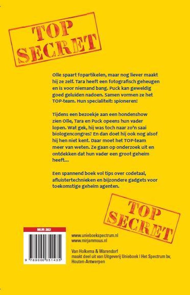 Olle spaart fopartikelen, maar nog liever maakt hij ze zelf. Tara heeft een fotografisch geheugen en is voor niemand bang. Puck kan geweldig goed geluiden nadoen. Samen vormen ze het TOP-team. Hun specialiteit: spioneren! Tijdens een bezoekje aan een hondenshow zien Olle, Tara en Puck opeens hun vader lopen. Wat gek, hij was toch naar zo'n saai biologencongres? En dan doet hij ook nog alsof hij hen niet kent. Daar moet het TOP-team meer van weten. Ze gaan op onderzoek uit en ontdekken dat hun vader een groot geheim heeft... Een spannend boek vol tips over codetaal, afluistertechnieken en bijzondere gadgets voor toekomstige geheim agenten.