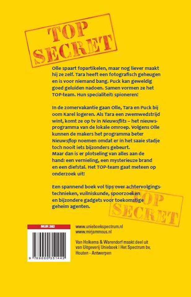 Olle spaart fopartikelen, maar nog liever maakt hij ze zelf. Tara heeft een fotografisch geheugen en is voor niemand bang. Puck kan geweldig goed geluiden nadoen. Samen vormen ze het TOP-team. Hun specialiteit: spioneren! In de zomervakantie gaan Olle, Tara en Puck bij oom Karel logeren. Als Tara een zwemwedstrijd wint, komt ze op tv in Nieuwsflits - het nieuwsprogramma van de lokale omroep. Volgens Olle kunnen de makers het programma beter Nieuwsflop noemen omdat er in het saaie stadje toch nooit iets bijzonders gebeurt. Maar dan is er plotseling van alles aan de hand: een vernieling, een mysterieuze brand en een diefstal. Het TOP-team gaat meteen op onderzoek uit! Een spannend boek vol tips over achtervolgingstechnieken, vuilniskunde, spoorzoeken en bijzondere gadgets voor toekomstige geheim agenten.