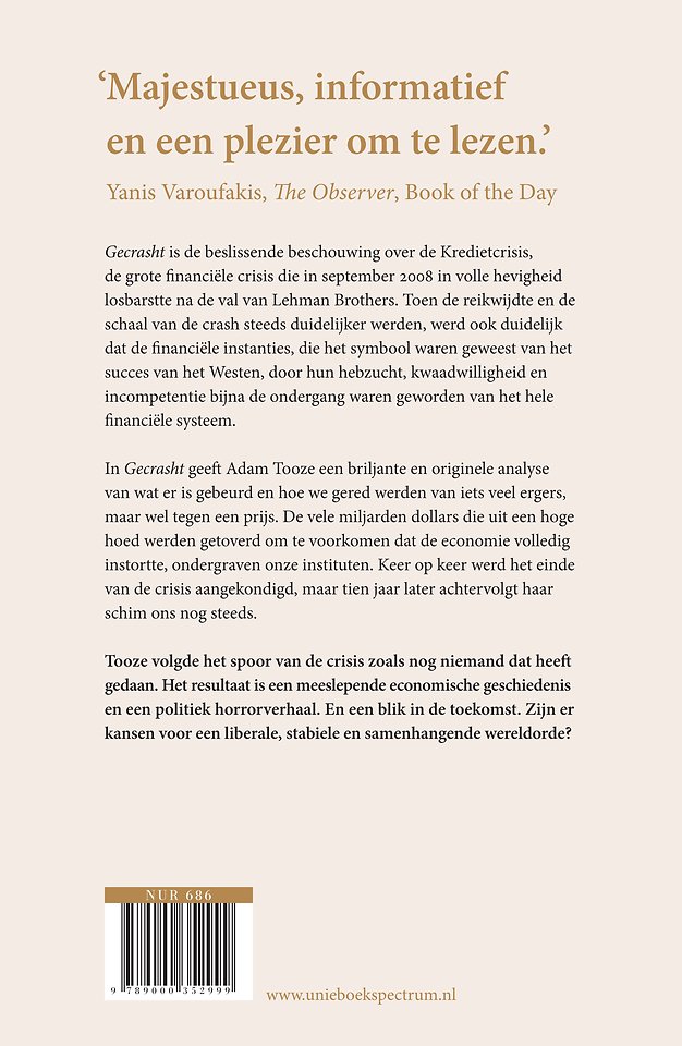 In Gecrasht toont Adam Tooze de toppen van zijn historische kunnen. Hij geeft een originele en volledige schets van de geschiedenis van de bankencrisis en werkt vanuit een breed en gedetailleerd perspectief waarin hij verschillende keerpunten in de recente internationale geschiedenis betrekt. Wat is het verband tussen de Irakoorlog die in 2003 begon, de economische crisis van 2008 en de politieke situatie van de VS in 2018? Om de bankencrisis beter te begrijpen, plaatst Tooze deze in een bredere (geo)politieke context, onderzoekt haar invloed op Europa en Azië en toont aan dat het Westen zijn talent voor ‘grote strategie’ heeft verloren; in financiële politiek, diplomatie, veiligheid en binnenlandse politiek.