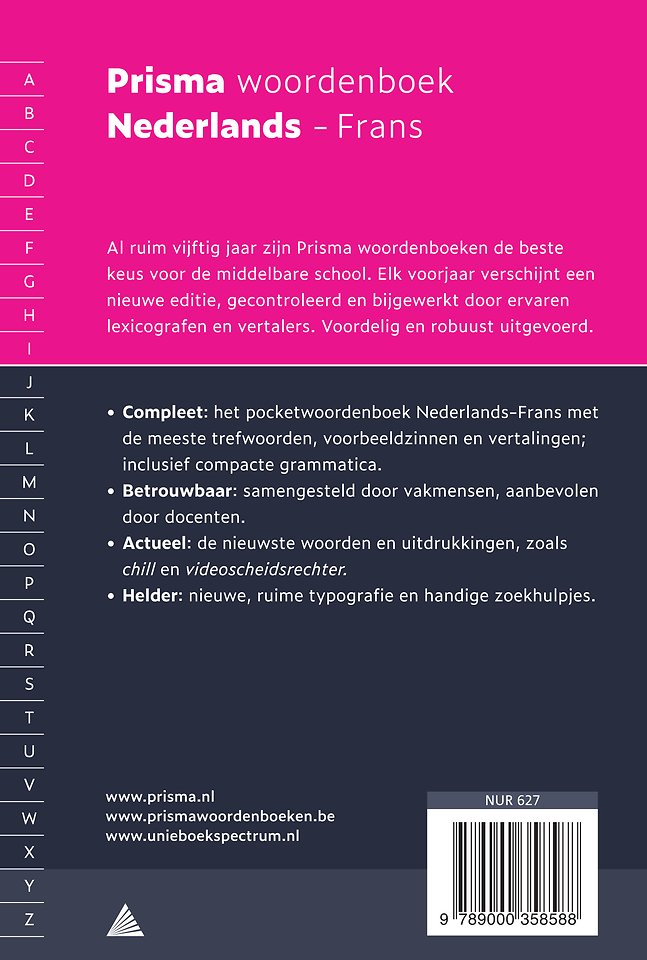 woordenboek nederlands-frans taal frans prisma vertalen naslagwerk nederland taalonderwijs grammatica schoolwoordenboek pocketwoordenboek trefwoorden onderwijs middelbare school voorbeeldzinnen betekenis vreemde talen woordsoorten zoeken leren idioom gebruiksaanwijzing uitspraak klemtoon woordbenoemen alfabetisch zelfstandig naamwoord zinsontleding actueel
