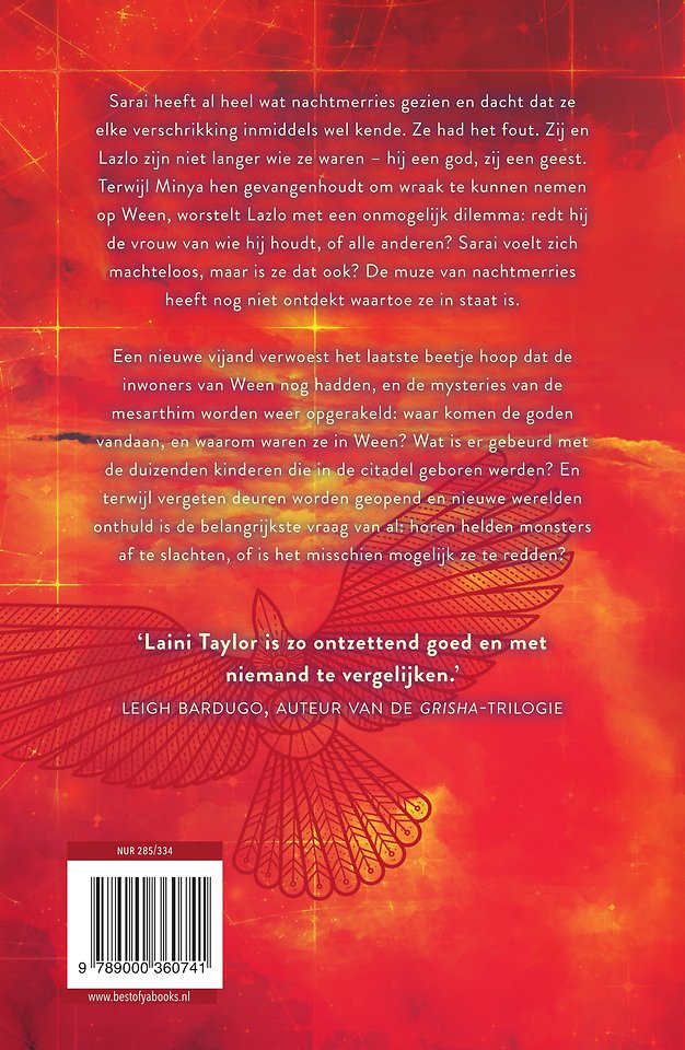 Sarai heeft al heel wat nachtmerries gezien en dacht dat ze elke verschrikking inmiddels wel kende. Ze had het fout. Zij en Lazlo zijn niet langer wie ze waren – hij een god, zij een geest. Terwijl Minya hen gevangenhoudt om wraak te kunnen nemen op Ween, worstelt Lazlo met een onmogelijk dilemma: redt hij de vrouw van wie hij houdt, of alle anderen? Sarai voelt zich machteloos, maar is ze dat ook? De muze van nachtmerries heeft nog niet ontdekt waar ze toe in staat is.