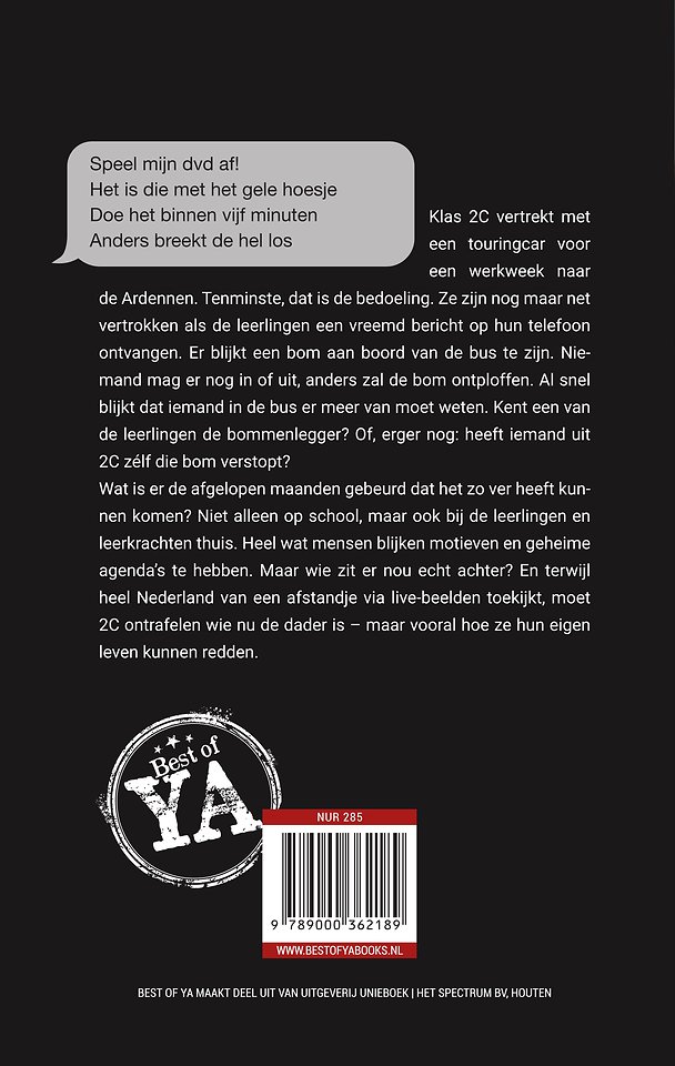 Klas 2C vertrekt met een touringcar voor een werkweek naar de Ardennen. Tenminste, dat is de bedoeling. Ze zijn nog maar net vertrokken als de leerlingen een vreemd bericht op hun telefoon ontvangen. Er blijkt een bom aan boord van de bus te zijn. Niemand mag er nog in of uit, anders zal de bom ontploffen. Al snel blijkt dat iemand in de bus er meer van moet weten. Kent een van de leerlingen de bommenlegger? Of, erger nog: heeft iemand uit 2C zélf die bom verstopt?