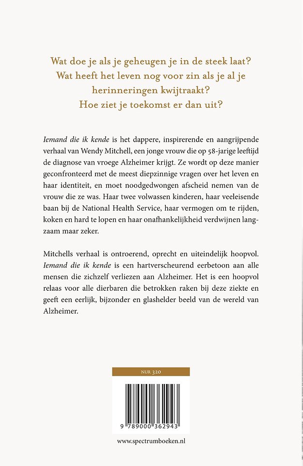 Iemand die ik kende is het dappere, inspirerende en verhelderende verhaal van Wendy Mitchell. Zij is een jonge vrouw die op 58-jarige leeftijd de diagnose van vroege Alzheimer krijgt. Ze wordt op deze manier geconfronteerd met de meest diepzinnige vragen over het leven en haar identiteit. En ze moet noodgedwongen afscheid nemen van de vrouw die ze was. Haar veeleisende baan bij de National Health Service, haar vermogen om te rijden, koken en hard te lopen en haar onafhankelijkheid verdwijnen langzaam maar zeker.