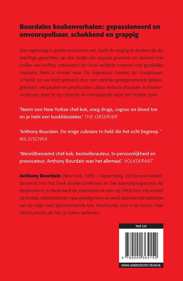 Anthony Bourdain (New York, 1956 - Kaysersberg, 2018) werd wereldberoemd met het boek Keukenconfessies en het televisieprogramma No Reservations, in Nederland en Vlaanderen te zien op 24Kitchen. Hij schreef op brutale, nietsontziende maar geestige toon en werd daarmee het prototype van de ruige maar gepassioneerde kok. Avontuurlijk, ruw in de mond, maar uiterst precies als het op koken aankwam.