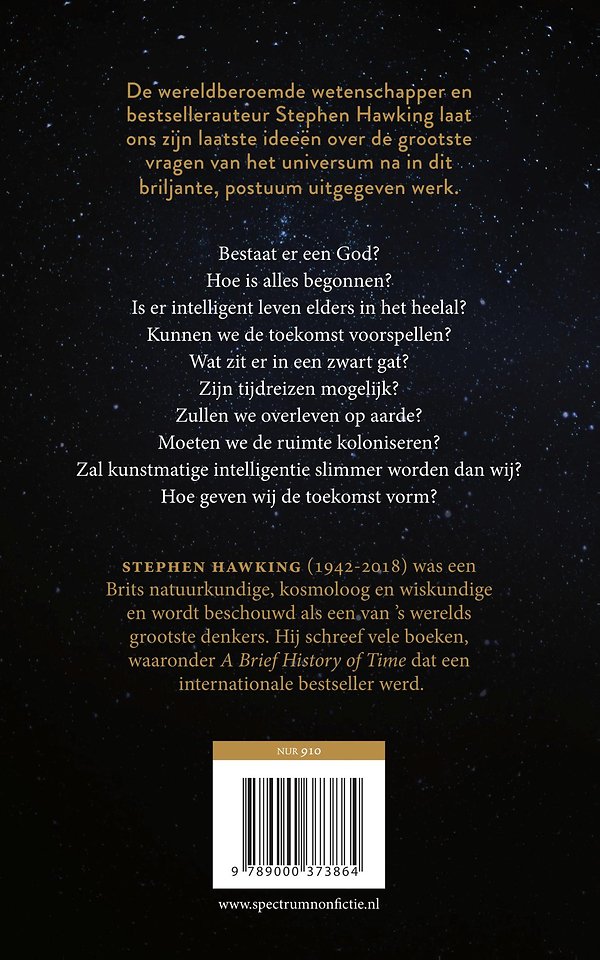 Ondernemers, politici, technici en collega-wetenschappers klopten regelmatig bij Hawking aan voor advies, commentaar en ideeën. Iedere uitspraak haalde de krantenkoppen en altijd waren zijn antwoorden persoonlijk. Soms in de vorm van interviews en lezingen en dan weer in essays of brieven. De antwoorden op de grote vragen bundelt een aantal van dit soort interessante inzichten, afkomstig uit Hawkings persoonlijke archief met elke keer een intro van bekende personen, zoals David Attenborough, Elon Musk en Paul Davies.