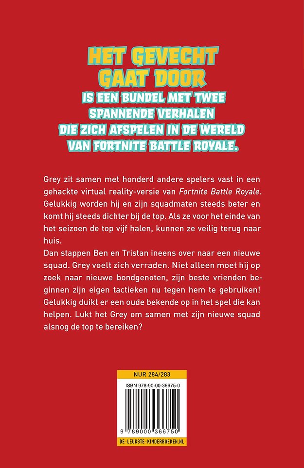 Ben jij gek op Fortnite? Lees dan deze toffe fan-fiction! Het gevecht gaat door is het tweede deel in de serie Gevangen in Battle Royale, met twee spannende verhalen die zich afspelen in de wereld van Fortnite: ‘Verraad in Salty Springs’ en ‘Gevaar bij Lucky Landing’. Perfect leesvoer voor iedereen die graag Fortnite speelt!