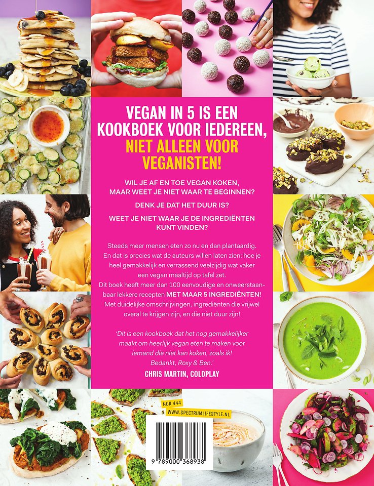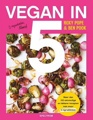 In Vegan in 5 laten de auteurs zien hoe je met slechts vijf ingrediënten regelmatig eenvoudig een heerlijke en plantaardige maaltijd op tafel kunt zetten. Hun boek bevat meer dan 100 eenvoudige en onweerstaanbaar lekkere vegan recepten. Hun omschrijvingen zijn helder en toegankelijk. De gebruikte ingrediënten zijn ruimschoots verkrijgbaar, en goedkoop. Van lichte en gezonde maaltijden, naar grootse desserts, of voedzame snacks, geschikt voor alle momenten en elke dag.