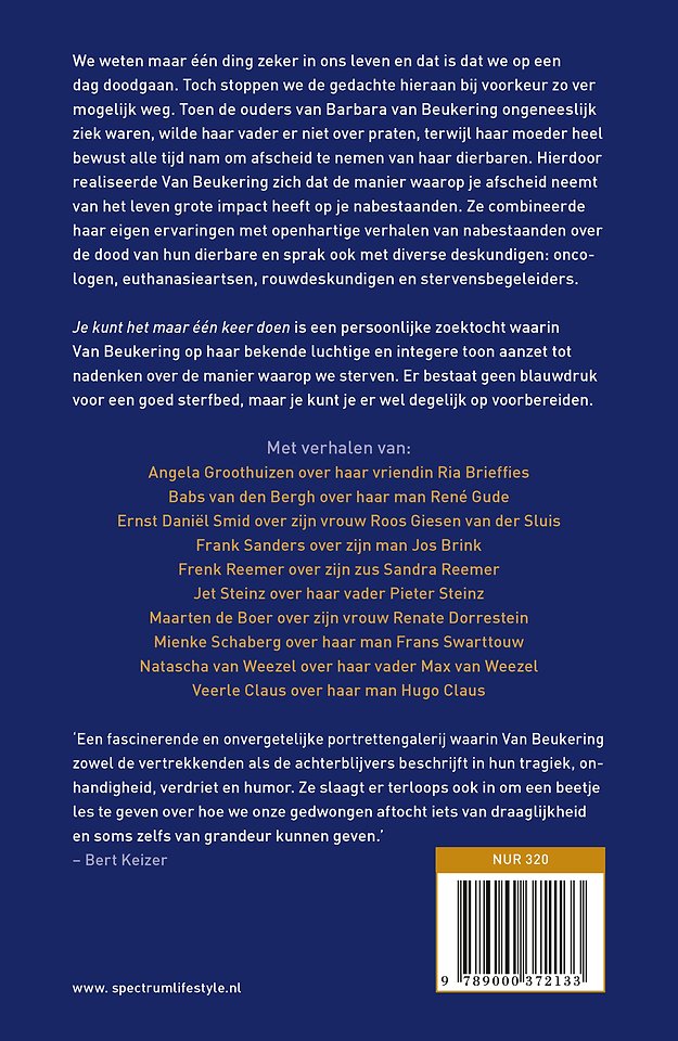 Je kunt het maar één keer doen is een persoonlijke zoektocht waarin Van Beukering op haar bekende luchtige en integere toon aanzet tot nadenken over de manier waarop we sterven. Er bestaat geen blauwdruk voor een goed sterfbed, maar je kunt je er wel degelijk op voorbereiden.