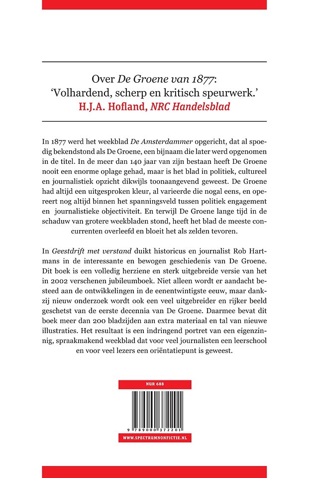 In Geestdrift met verstand duikt historicus en journalist Rob Hartmans in de interessante en bewogen geschiedenis van De Groene. Dit boek is een volledig herziene en sterk uitgebreide versie van het in 2002 verschenen jubileumboek. Niet alleen wordt er aandacht besteed aan de ontwikkelingen in de eenentwintigste eeuw, maar dankzij nieuw onderzoek wordt ook een veel uitgebreider en rijker beeld geschetst van de eerste decennia van De Groene. Daarmee bevat dit boek meer dan 200 bladzijden aan extra materiaal en tal van nieuwe illustraties. Het resultaat is een indringend portret van een eigenzinnig, spraakmakend weekblad dat voor veel journalisten een leerschool en voor veel lezers een oriëntatiepunt is geweest.