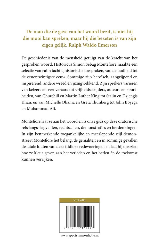 Gerenommeerd historicus Simon Sebag Montefiore duikt opnieuw in de geschiedenis van het woord, ditmaal aan de hand van historische toespraken. Waar brieven hun werk doorgaans uitsluitend achter de schermen verrichten, wendt Montefiore zich nu tot het grote publiek met dit eerbetoon aan de belangrijkste speeches in de wereldgeschiedenis.