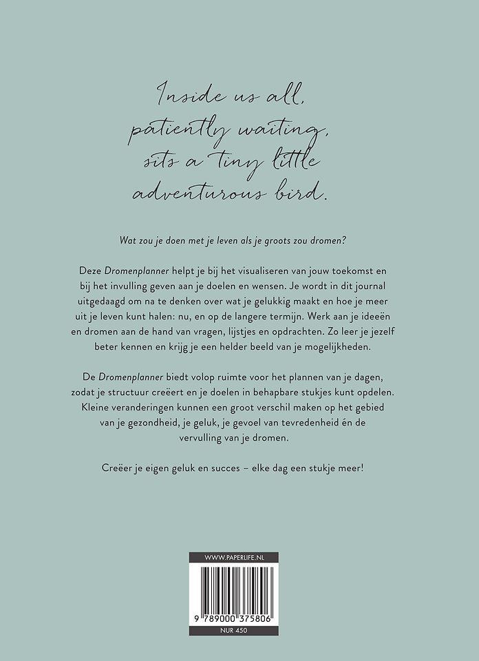 De Dromenplanner biedt volop ruimte voor het plannen van je dagen, zodat je structuur creëert en je doelen in behapbare stukjes kunt opdelen. Kleine veranderingen kunnen een groot verschil maken op het gebied van je gezondheid, je geluk, je gevoel van tevredenheid én de vervulling van je dromen.