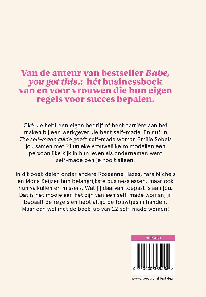Oké. Je hebt een eigen bedrijf of bent carrière aan het maken bij een werkgever. Je bent self-made. En nu? In The self-made guide neemt self-made woman Emilie Sobels jou samen met 23 unieke vrouwelijke rolmodellen mee in hun leven als ondernemer, want self-made ben je gelukkig nooit alleen.