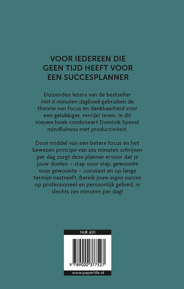 Door middel van een betere focus en het bewezen principe van zes minuten schrijven per dag zorgt deze planner ervoor dat jouw doelen – stap voor stap, gewoonte voor gewoonte – constant en op lange termijn nastreeft. Bereik jouw eigen succes op professioneel en persoonlijk gebied, in slechts zes minuten per dag!