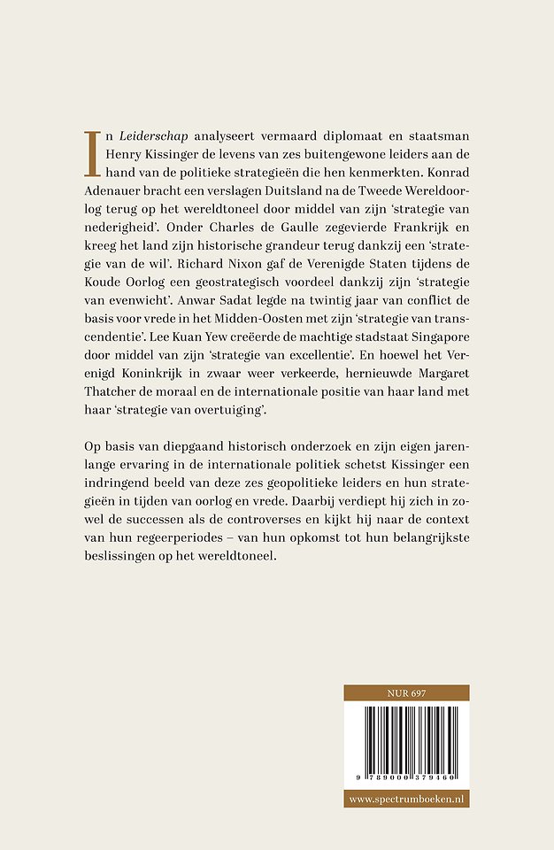 In zijn langverwachte nieuwe boek verdiept Henry Kissinger zich in de leiderschapsstijlen van zes invloedrijke wereldleiders uit de moderne geschiedenis: Charles de Gaulle, Konrad Adenauer, Margaret Thatcher, Richard Nixon, Lee Kuan Yew en Anwar Sadat.