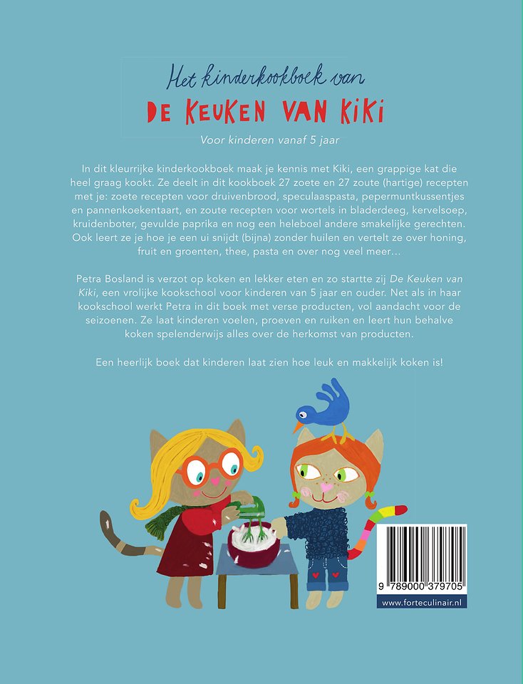 In dit kleurrijke kinderkookboek maak je kennis met Kiki, een vrolijke kat die heel graag kookt. Ze deelt in dit kookboek 27 zoete en 27 hartige (‘zoute’) recepten met je: zoete recepten voor druivenbrood, speculaaspasta, pepermuntkussentjes en pannenkoekentaart, en hartige recepten voor wortels in bladerdeeg, kervelsoep, kruidenboter en gevulde paprika. Ook leert Kiki je hoe je een ui snijdt (bijna) zonder huilen. Ze vertelt over honing, fruit en groenten, thee, pasta en over nog veel meer