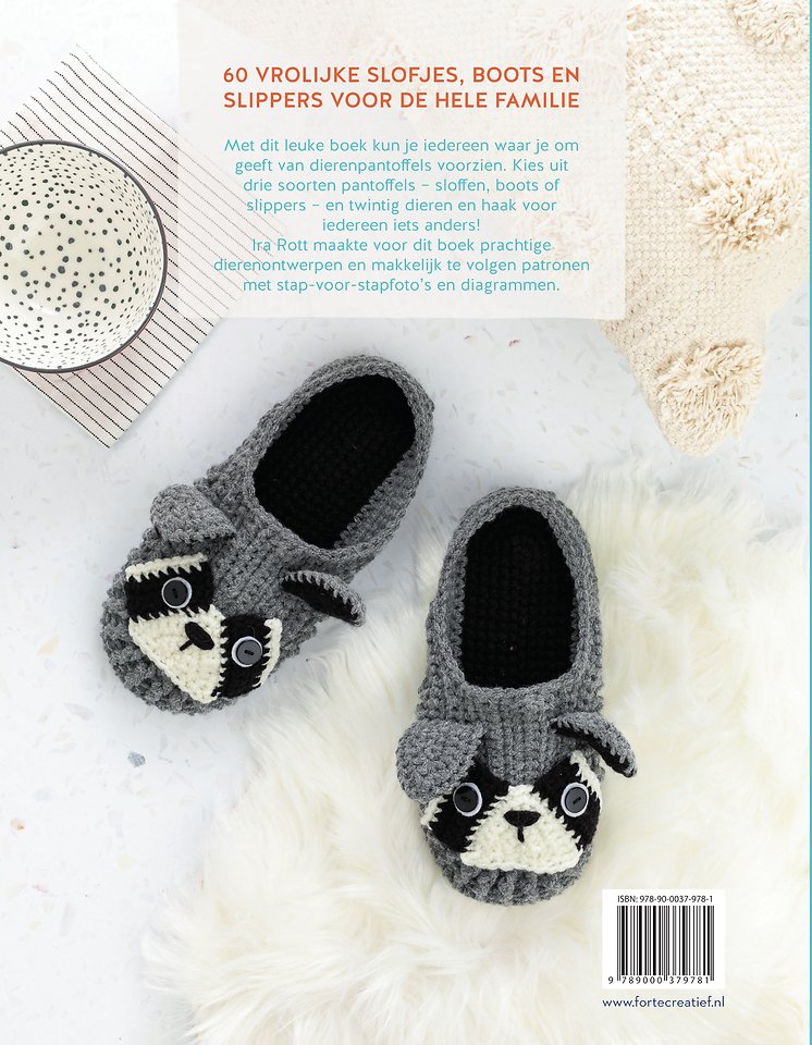 Welk model wil je haken? Van alle patronen in dit boek zijn drie modellen opgenomen: slippers, slofjes en laarsjes. Na de algemene uitleg volgen de hoofdstukken met de dieren: hondenslippers, berenschoentjes, pingui¨nslofjes en ga zo maar door. Het zijn 20 modellen, met nog wat extra variaties. Het boek is geschikt voor de enigszins ervaren hakers.